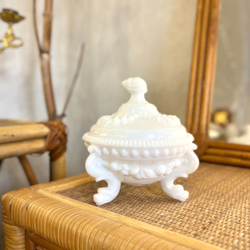 Bonbonnière ou boite en opaline reposant sur 3 pieds en forme de têtes de dauphins et ornée de coquillages en relief