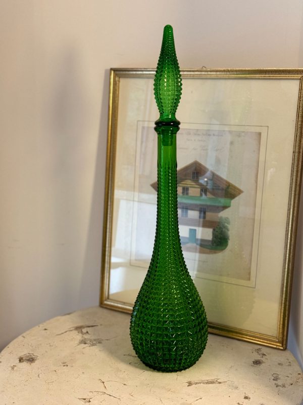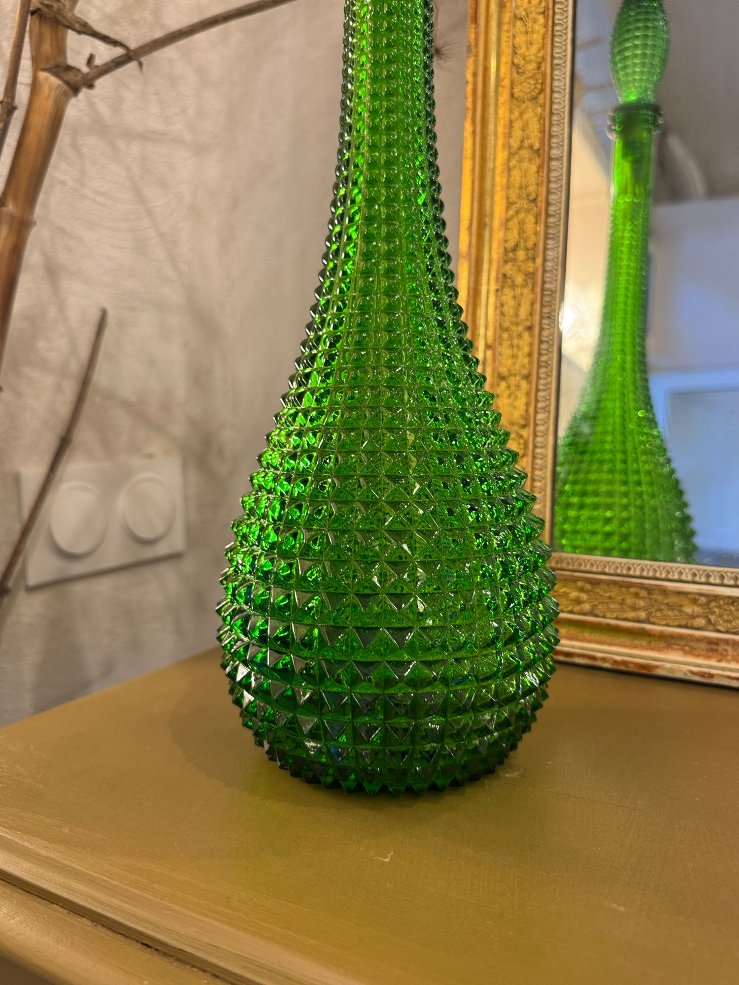 Grande carafe Empoli en verre vert au décor de pointes de diamants en relief