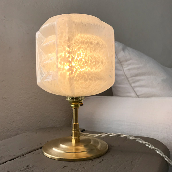 Lampe de table composée d’un globe en verre de Clichy blanc moucheté et d’un pied en laiton